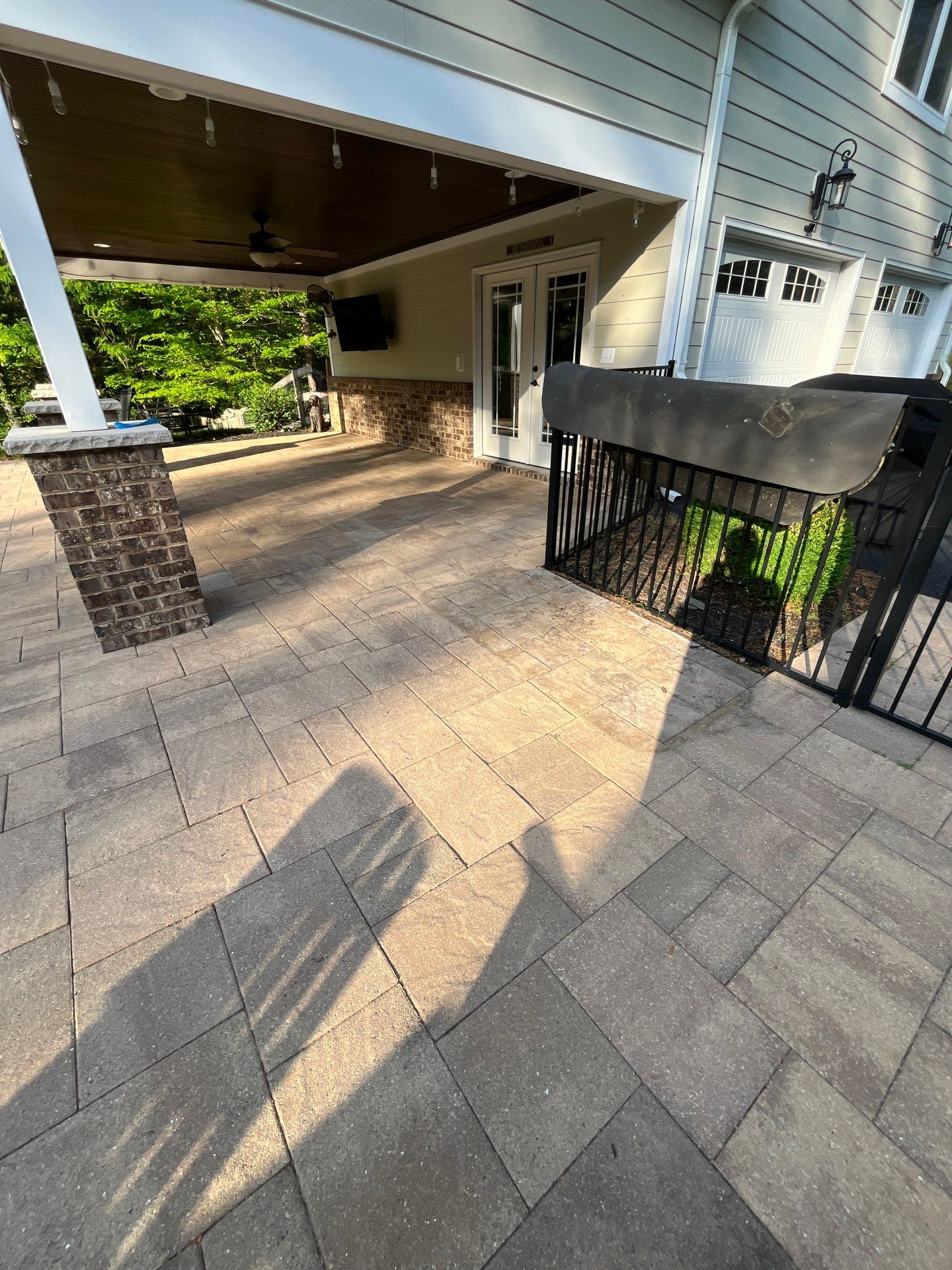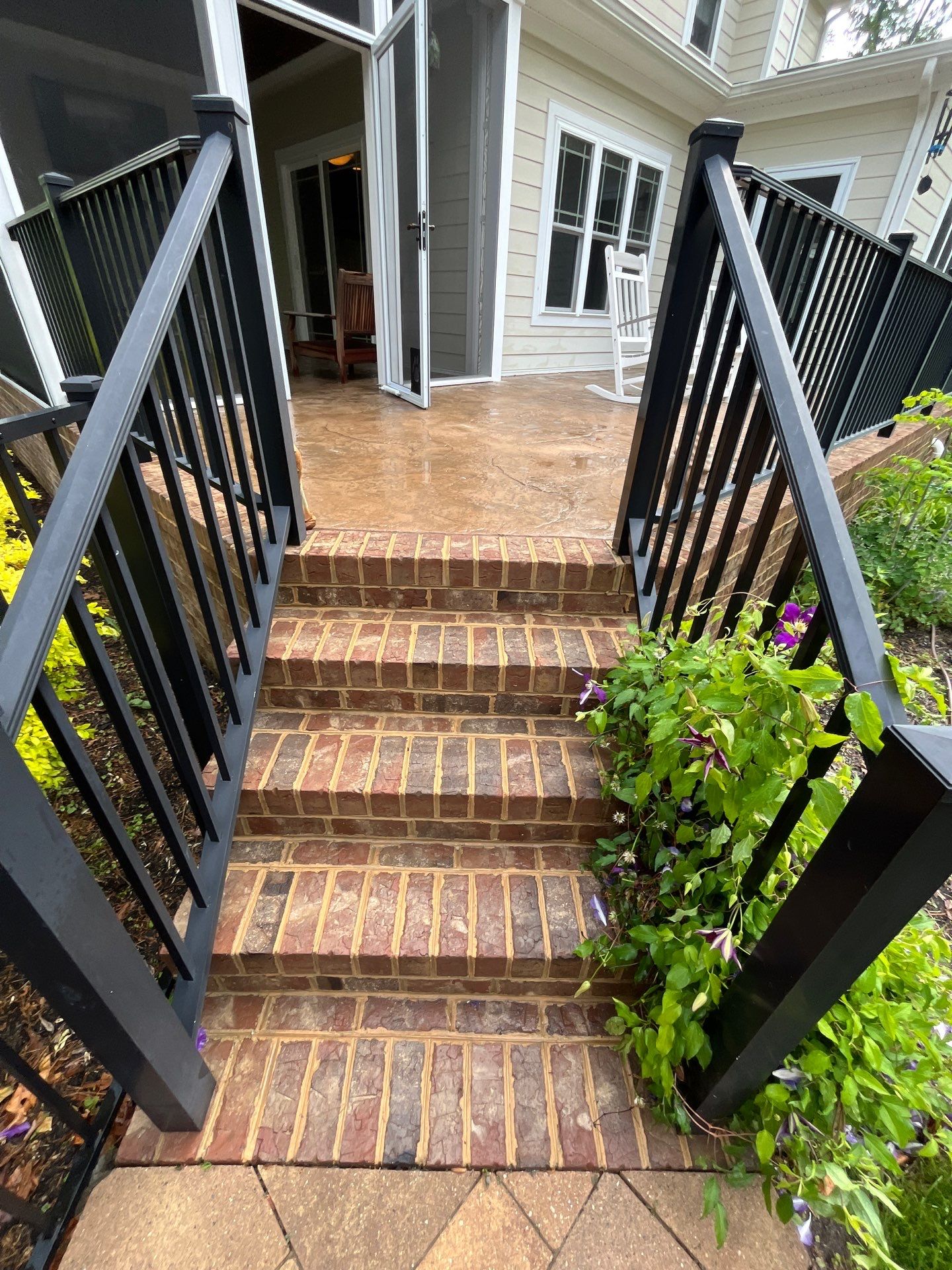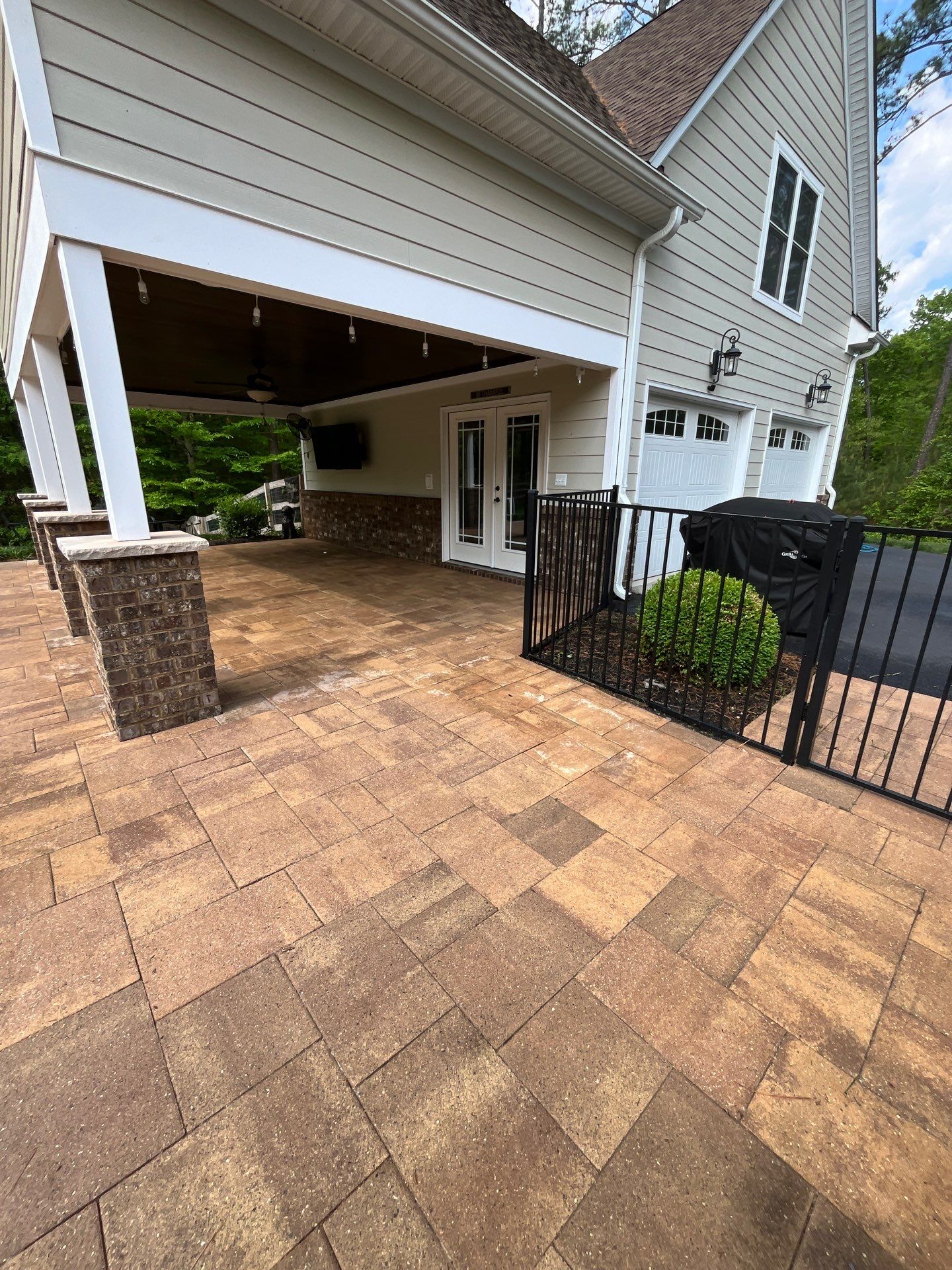The back porch was the next area to receive attention. Often an extension of the home, the back porch can become a gathering spot for family and friends. This particular back porch had a lot of buildup from foot traffic, weather, and natural elements. Using a combination of soft washing and pressure washing, we carefully cleaned the back porch floor, ensuring the surface was both safe and visually appealing. Whether it’s hosting gatherings or simply enjoying a quiet evening, the back porch is now ready to be used again, looking as good as new.